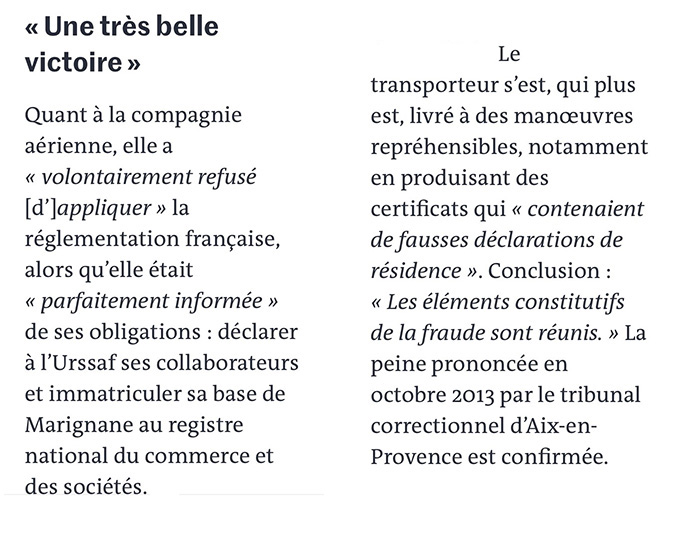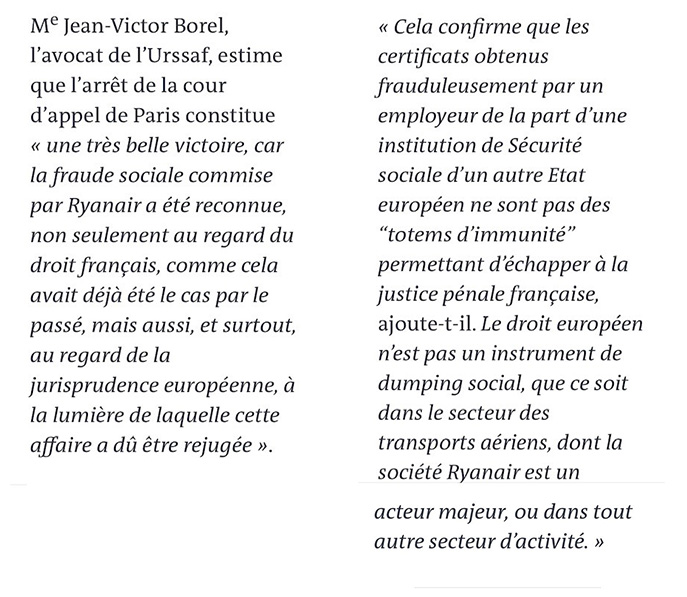 « Représenté par Me Jean-Victor BOREL, le cabinet BOREL & DEL PRETE obtient une nouvelle fois la condamnation de la société Ryanair au profit de l'URSSAF pour fraude à la sécurité sociale française