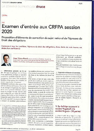 Correction du sujet de l'épreuve de droit des obligations de l'examen national d'entrée à l'Ecole des Avocats / CRFPA session 2021 par Maître Jean-Victor Borel dans la revue juridique de référence la Semaine Juridique édition générale